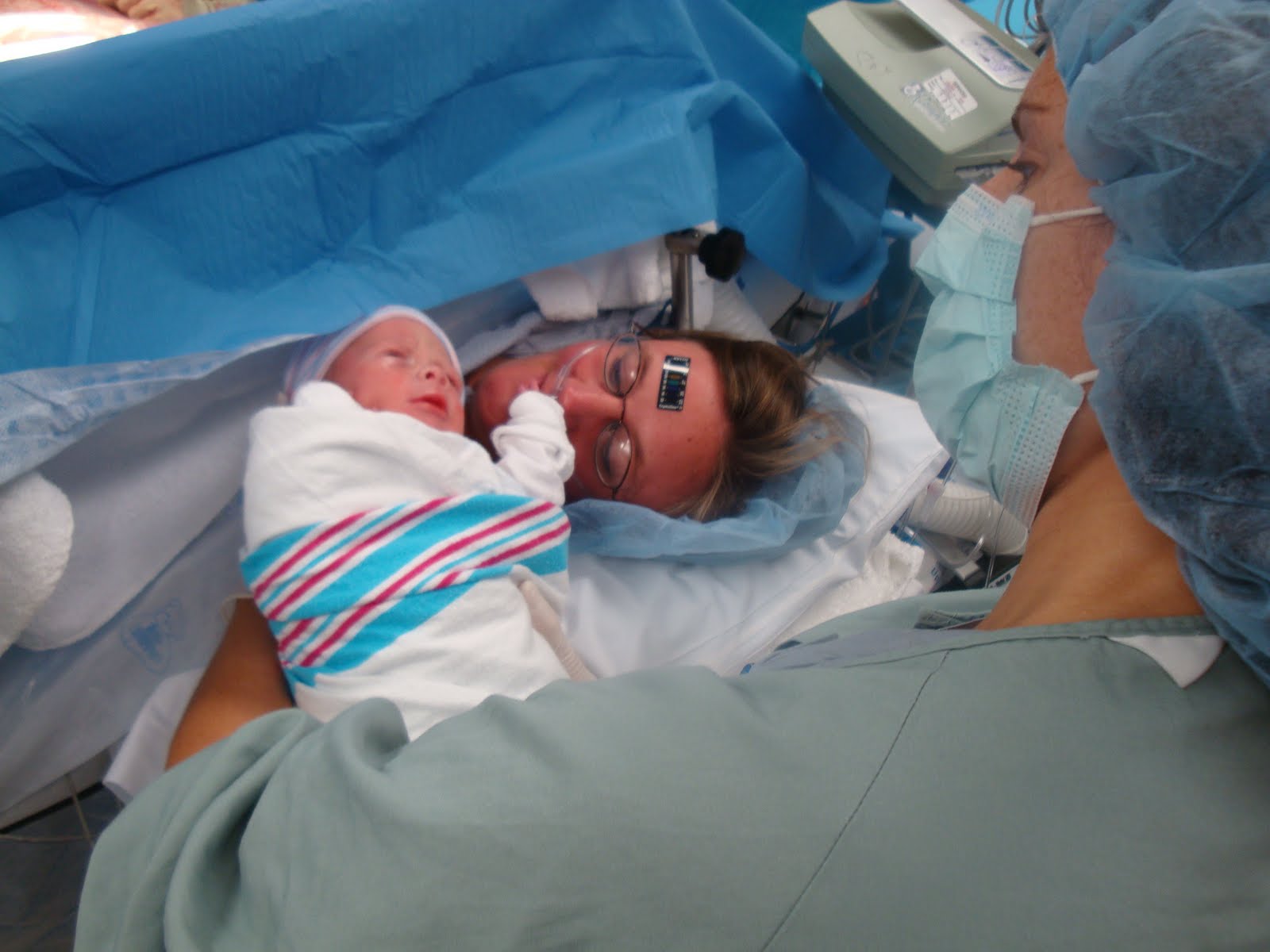 Mike walked with me but they made him stop right before the doors and sit on a bench while they prepped me... I walked in with my doctor into the VERY bright and VERY cold room. They had me sit on the bed and was ready to put my spinal in... knowing what I have heard about that spinal.. my whole body started shaking. My doctor put his hand on my shoulder and told me that everything will be okay... then the anestegiologist told me to hunch over so my back was curved - very hard to do with a twin/37 week belly infront of you... I asked for a pillow to hug and that helped. I closed my eyes and held my breath... I felt the prick and I what felt like a balloon being inflated in my back... just as they said. But pain? I felt no pain. The doctor then told me that he was done with my spinal... I remember saying "that was it"?... they then told me to go ahead and lay down but the medication worked really fast and I was so numb that I couldn't move my legs to lay down so they had to help me. Then things moved fast... a blue sheet was put up infront of my face... the anesteologist was right next to me and soon as he asked me to tell him if I start feeling sick... I started feeling sick - he put something into my IV and the sick feeling was gone instantly. They had a fan like thing blowing warm air on me... I asked them if they can make that air cold.. I was getting hot... the doctor laughed because he never had anyone ask for the air to be cold.. usually everyone is cold in that room and wants heat on them. Soon Mike walked in and sat right by my head.. camera in hand. I asked Mike if they started yet... either the doctor or nurse heard me and said "not only have we started... we are almost to baby A". I could not believe how fast things were moving.. then I felt sick again.. and again the doctor took care of that fast! Then I heard a cry and I started crying myself... such relieve came over me... Mike got to his feet and was off to see Ian - after a quick check and a rough cleaning.. they brought Ian to me so I could see him and give him a kiss.